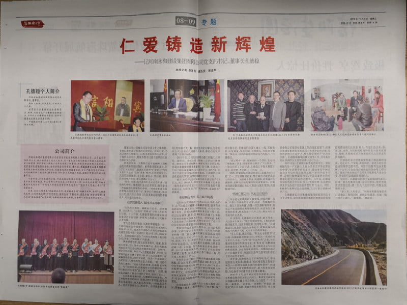 2018年11月7日,《信陽晚報》刊發(fā)了對河南永和建設集團有限公司黨支部書記、董事長孔德穩(wěn)的相關專訪內容,文章對于孔德穩(wěn)的創(chuàng)業(yè)之路、經營之道、踐行企業(yè)社會責任之舉以及弘揚傳統(tǒng)文化之策進行了深刻剖析。